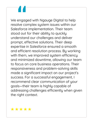 At Ngauge Digital, we take pride in delivering innovative IT solutions that drive business success. Here’s what our clients have to say about our expertise in Salesforce and OutSystems.